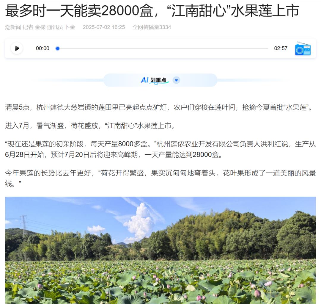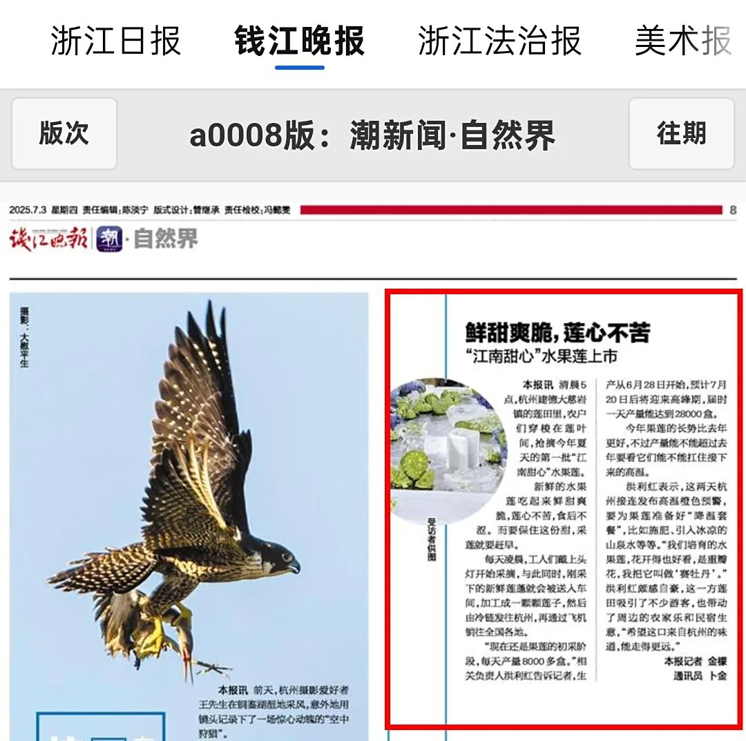 7月2日-7月3日,潮新闻客户端、《钱江晚报》报道了大慈岩镇果农凌晨抢收“江南甜心”水果莲,通过冷链空运销往全国,高温下力保鲜甜品质,同时以“赛牡丹”莲田带动农旅融合。