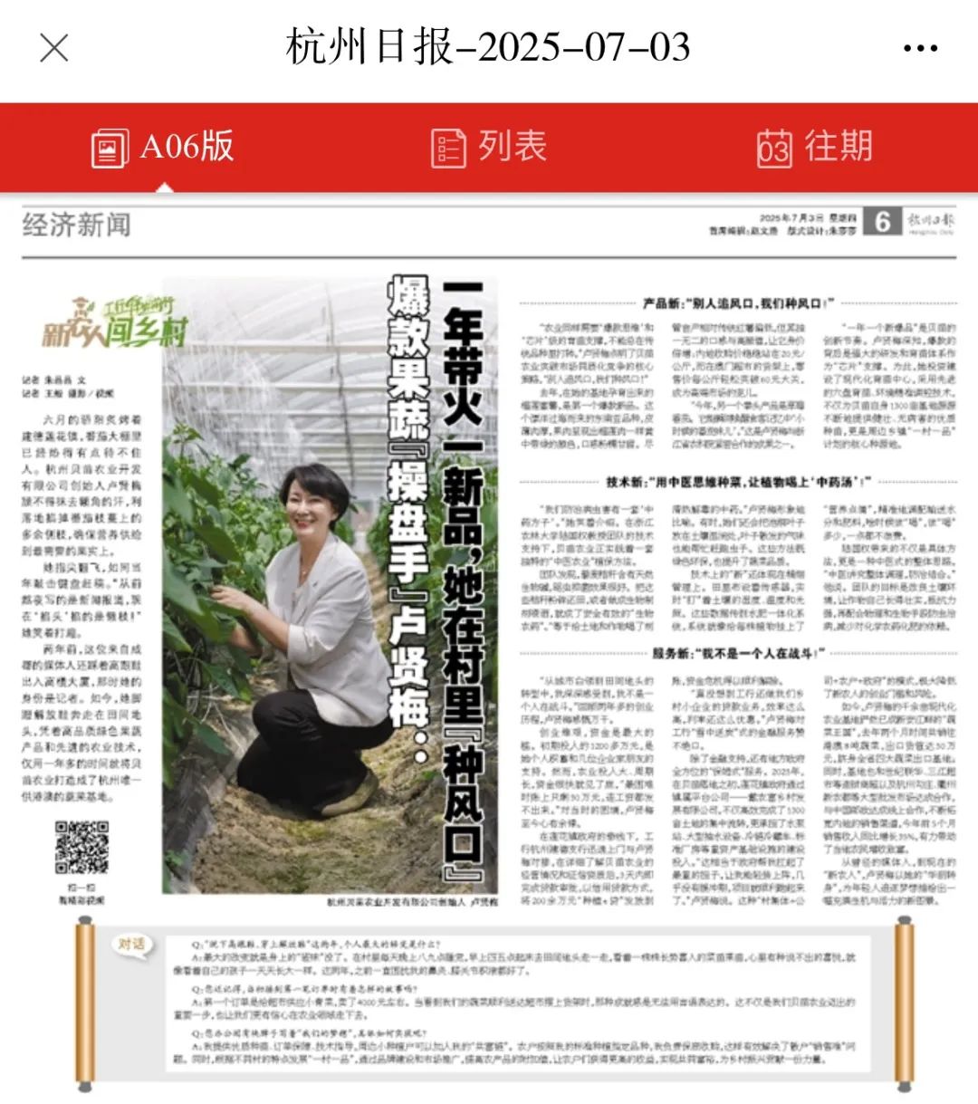 7月3日,《杭州日报》、杭州新闻客户端报道了杭州贝苗农业开发有限公司创始人卢贤梅由记者转型新农人,以“爆款思维+中医农业+政银支持”打造高端蔬菜基地,带动乡村共富。