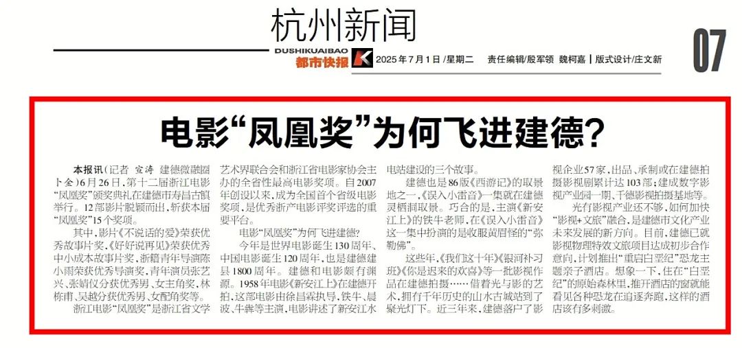 7月1日,《都市快报》报道了浙江电影“凤凰奖”颁奖礼落地建德寿昌古镇,12部影片斩获15奖,借千年古城影视基因加速“影视+文旅”融合。