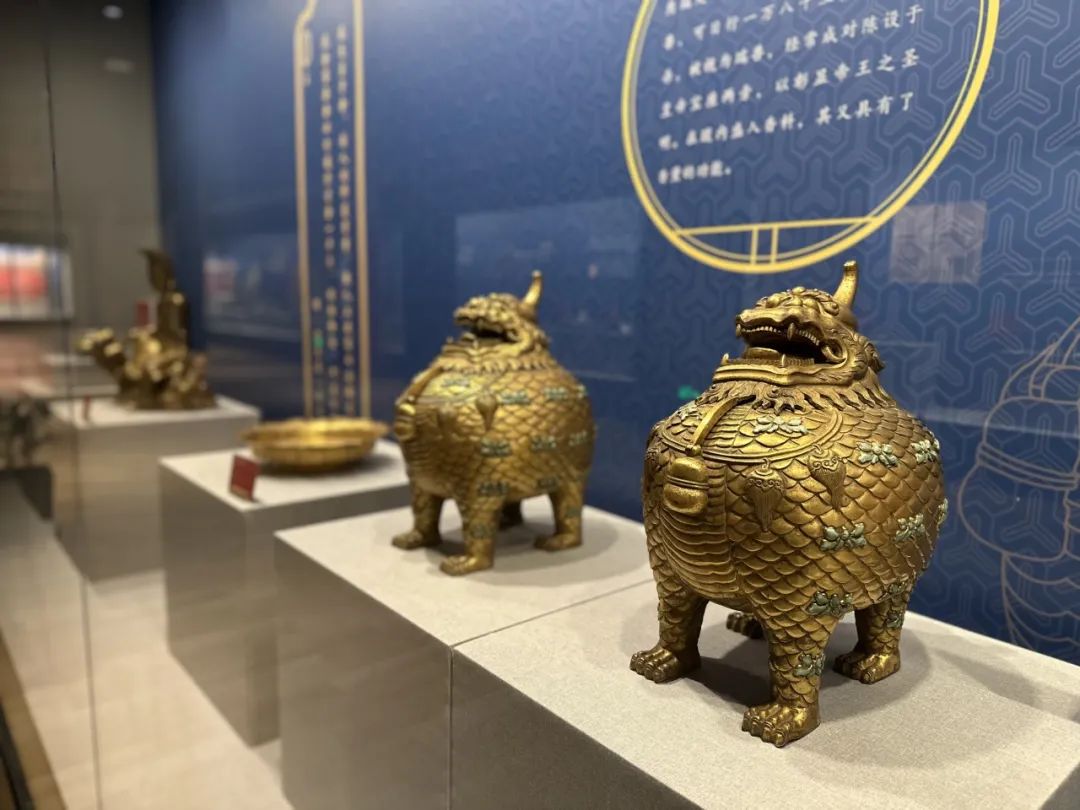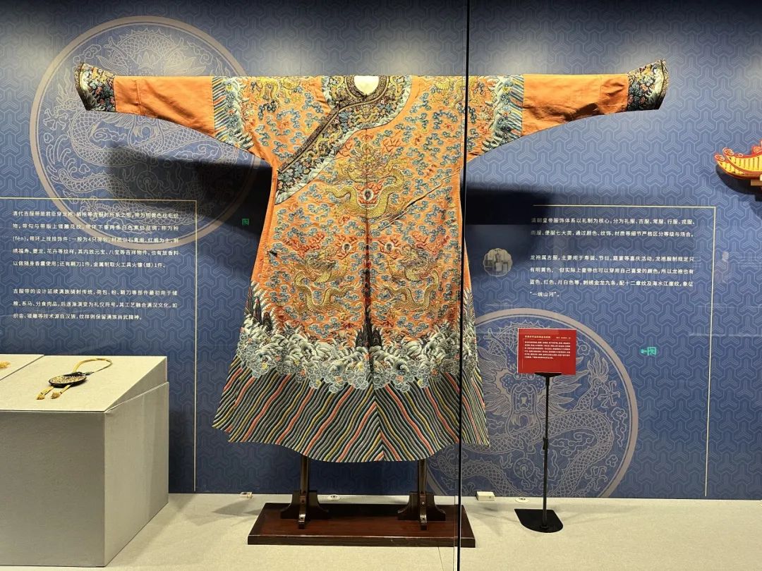 步入“经纬华章”展区,一件清杏黄纱平金彩绣金龙单袍占据视觉中心。龙袍以九条金龙统御山河,十二章纹与海水江崖纹密布其间,彰显“一统山河”的威仪。在“器韵流光”展区,一对铜镀金甪端香薰昂首而立,既是皇权威仪的象征,亦为实用熏香器具。“吉纹万象”展区则通过如掐丝珐琅松鹿如意、银镀金寿字火碗、掐丝珐琅大吉葫芦挂屏等器物,为观众揭开“符瑞”之谜。