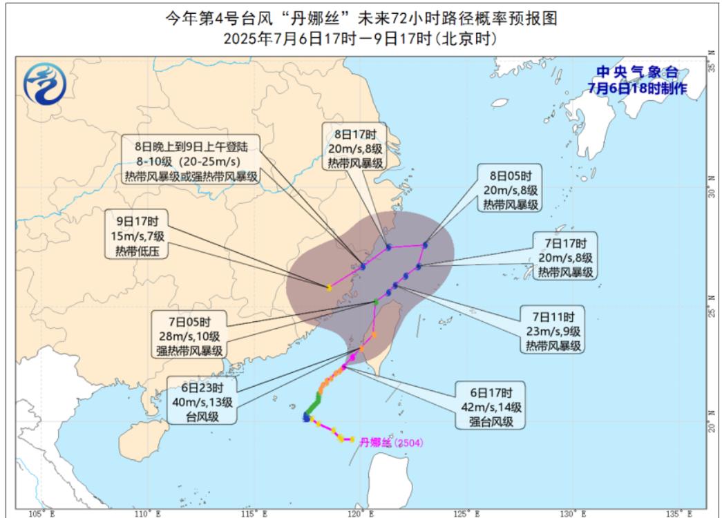 台风“丹娜丝”不像典型的“直球型”台风直奔陆地,而是走了一条“蛇形走位”,先靠近台湾,再转向福建、浙江沿海。浙江省气象台最新研判:“丹娜丝”预计强度会有略微减弱,但风雨影响可能比预期更持久。7日浙江沿海地区有中到大雨,部分暴雨,局部暴雨;8日沿海和浙中南地区有中到大雨部分暴雨,局部大暴雨;9日浙中南地区部分中到大雨,局部大暴雨。