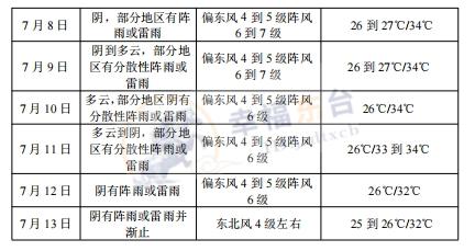降水预报:7月7日14时至8日14时,浙江东部、台湾岛等地部分地区有大到暴雨,其中,浙江东部部分地区有大暴雨(100~180毫米)。