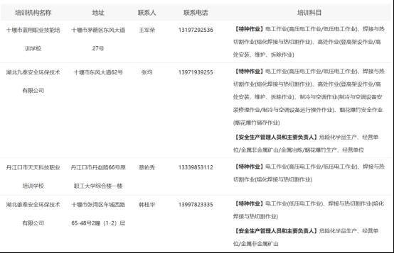 近日,十堰市应急管理局公布4所拥有安全生产培训资质的正规培训机构,包括:十堰市蓝翔职业技能培训学校、湖北九泰安全环保技术有限公司、丹江口市天天科技职业培训学校、湖北雄泰安全环保技术有限公司。公众如发现上述培训机构存在违规行为或市面上存在无证无照培训机构,可拨打0719-8119575进行举报。
