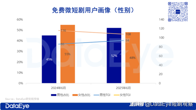 从性别分布来看,今年以来,免费微短剧的男性用户在占比和偏好度(TGI)上均出现上升。这一变化意味着免费微短剧的用户性别构成正趋向均衡,对男性用户群体的覆盖范围在逐步扩大。