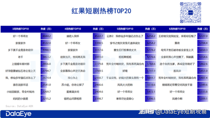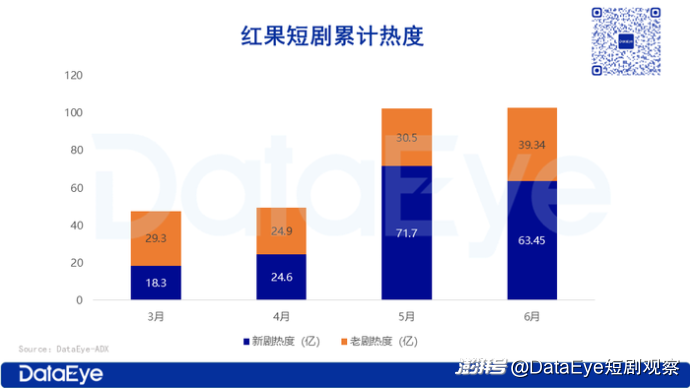 新规调整后,红果短剧单月热度突破百亿。6月,红果平台 TOP500 微短剧累计总热度达 102.79 亿,与5月持平。该平台于 4 月底对热度统计规则进行调整 —— 将 14 天累计播放热度调整为 7 日日均播放热度,并取消热度上限。规则调整后,平台微短剧热度普遍大幅上涨。(注:受规则调整影响,5、6 月的平台热度数据与 3、4 月不具备可比性)