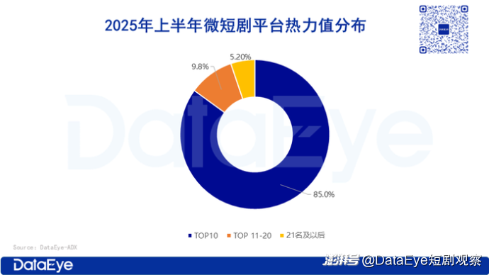 ADX短剧版数据显示:国内微短剧平台的热力值呈现高度集中态势,头部 TOP10 平台的热力值占比高达 85%,TOP11-20 的平台占比约 9.8%,而排名 21 位及以后的平台热力值占比仅为 5.2%。
