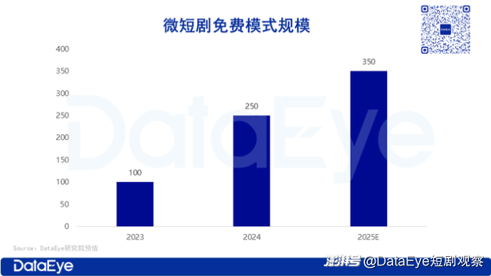 DataEye研究院预估:2025年中国免费微短剧市场规模约350亿元,较2024年同比增长40%,免费短剧模式在整个微短剧市场中的占比将达到 55% 左右,主要由于: