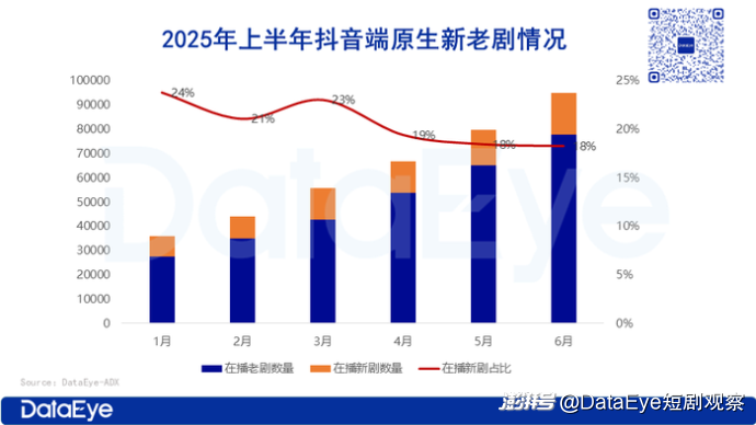 从整体趋势来看,抖音端原生微短剧市场极速飙升。2025年6月,在播微短剧数量突破9.49万,创历史新高;在播新剧数超1.73万部,占比约18%。