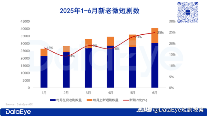 ADX短剧版数据显示:2025年上半年,参与投流的微短剧总数(去重)超6.63万部,其中新剧总数超3.96万部,占比约60%。