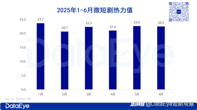 ADX短剧版数据显示:2025年上半年大陆市场微短剧热力值总额约132亿元。上半年,短剧的热力值整体呈波动趋势,单月热力值维持在20-24亿元左右,单月平均热力值达22亿元。