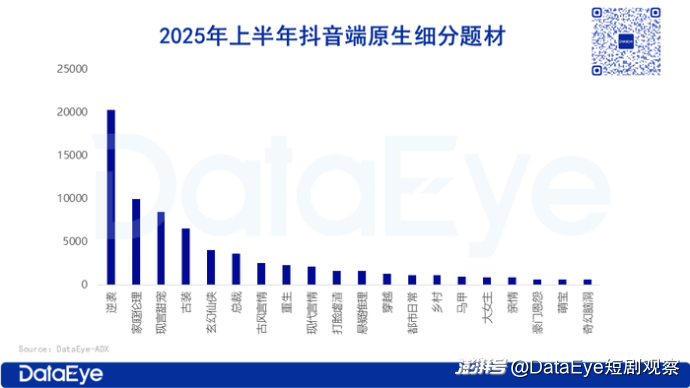 在抖音端原生微短剧的题材分布中,逆袭、家庭伦理和现言甜宠题材包揽前三名。其中,逆袭题材表现尤为突出,在投微短剧数量突破 2 万部。