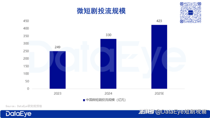 DataEye研究院预估:2025年微短剧投流规模将达约 423亿元,同比2024年增长28%。