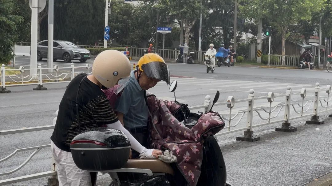 7月8日上午9点左右,记者在高昌路沪宜公路路口看到,原本晴朗的天气突然“变脸”,雨势逐渐增大,赶路的市民纷纷靠边停车,拿出雨披披上。