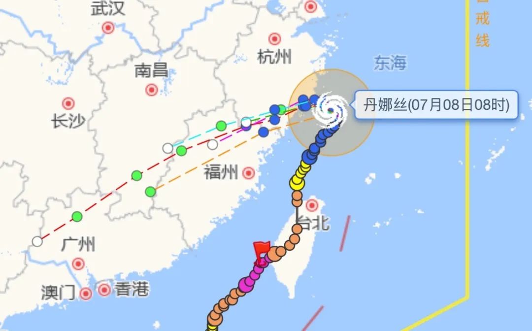 今年第4号台风“丹娜丝”今天08时中心距离浙江省温岭市东偏南方向约100公里(北纬27.9度、东经122.2度),中心附近最大风力9级(23米/秒,热带风暴级)。预计台风中心将以每小时5~10公里的速度向偏西方向缓慢移动,强度维持或略有增强;将于今天下午到夜间在浙江台州至我市一带沿海再次登陆(9~10级,23~28米/秒,热带风暴级或强热带风暴级),登陆后将转向西偏南方向移动,强度缓慢减弱。