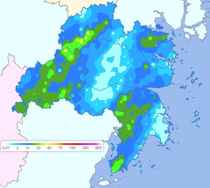 7月6日20时~8日17时全市累计降水量近3小时实况:今天14时到17时,全市面雨量10.6毫米,其中三门15.5毫米、临海13.6毫米、仙居12.5毫米、天台9.7毫米、黄岩9.5毫米、路桥4.6毫米、温岭4.5毫米、椒江4.0毫米、玉环3.8毫米;单点最大三门海游林场55.6毫米,小时雨强27.3毫米。沿海海面9~11级大风,风力最大温岭石塘一蒜岛30.1米/秒(11级)。