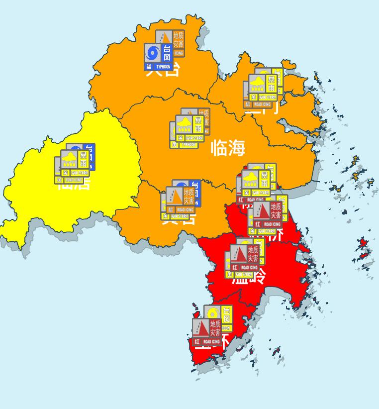 预警信号目前,椒江、黄岩、路桥、三门、临海、仙居、温岭、玉环暴雨黄色预警信号生效中;椒江、路桥、三门、临海、温岭、玉环台风黄色预警信号生效中,其它各县(市、区)台风蓝色预警信号生效中。