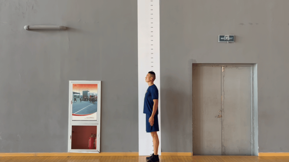 考核程序:考生双脚站立靠墙,单手伸直标记中指最高触墙点(示指高度),双脚立定垂直跳起,以单手指尖触墙,测量示指高度与跳起触墙高度之间的距离,两次测试,记录成绩较好的1次。