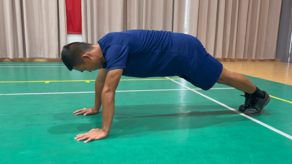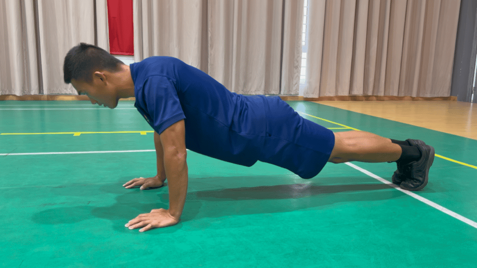 考核程序:按照规定动作要领完成动作。屈臂时肩关节高于肘关节、伸臂时双肘关节未伸直、做动作时身体未保持平直,该次动作不计数;除手脚外身体其他部位触及地面,结束考核。