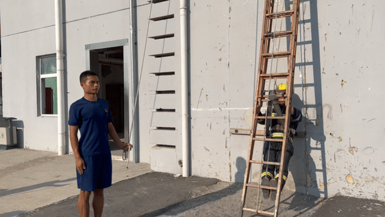 △正确示范考核方式:考生穿着全套消防员防护装具,扣好安全绳,从原地逐级攀登架设在训练塔窗口的六米拉梯,并进入二楼平台。记录时间。