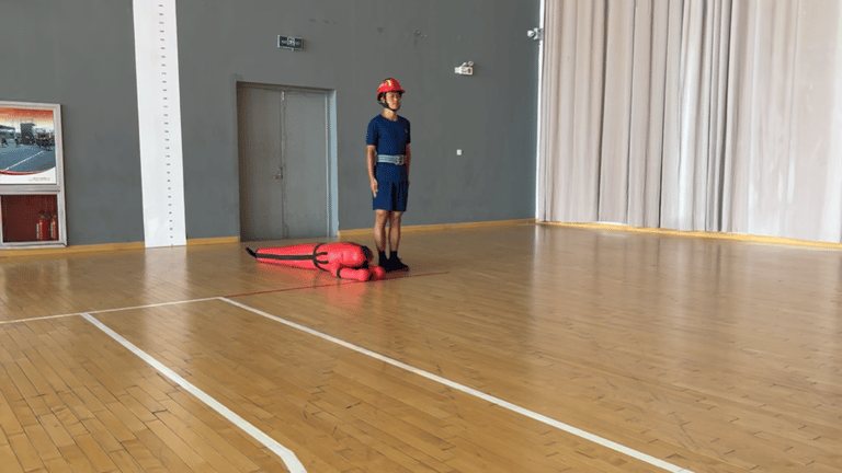 △正确示范考核程序:考生佩戴消防头盔及消防安全腰带,将60 公斤重的假人从起点线拖拽至距离起点线10米处的终点线(假人整体越过终点线)。记录时间。