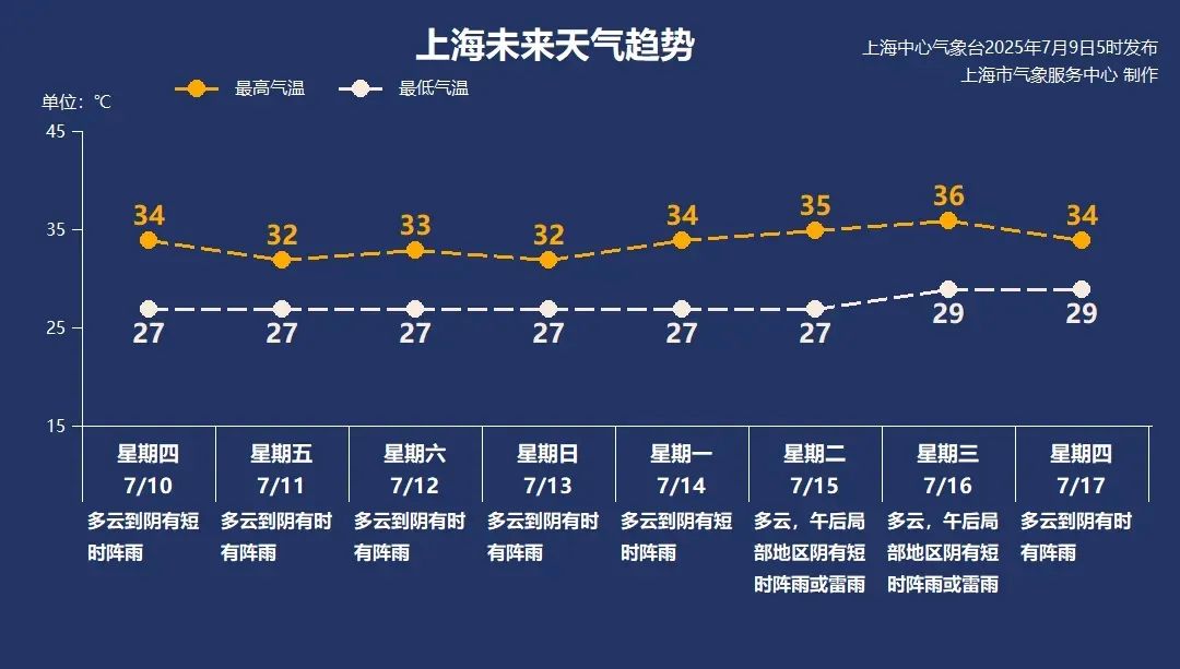受台风外围环流影响,今天(7月9日)上海多云为主,阳光、短时阵雨随机切换!未来9日多阵雨,气温在27℃-34℃之间,持续湿热,体感上蒸下煮!