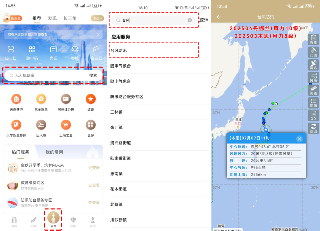 登录“随申办市民云”APP→首页搜索框中输入关键字“台风”→点击“台风防汛”进入服务页面,即可查看台风动向。