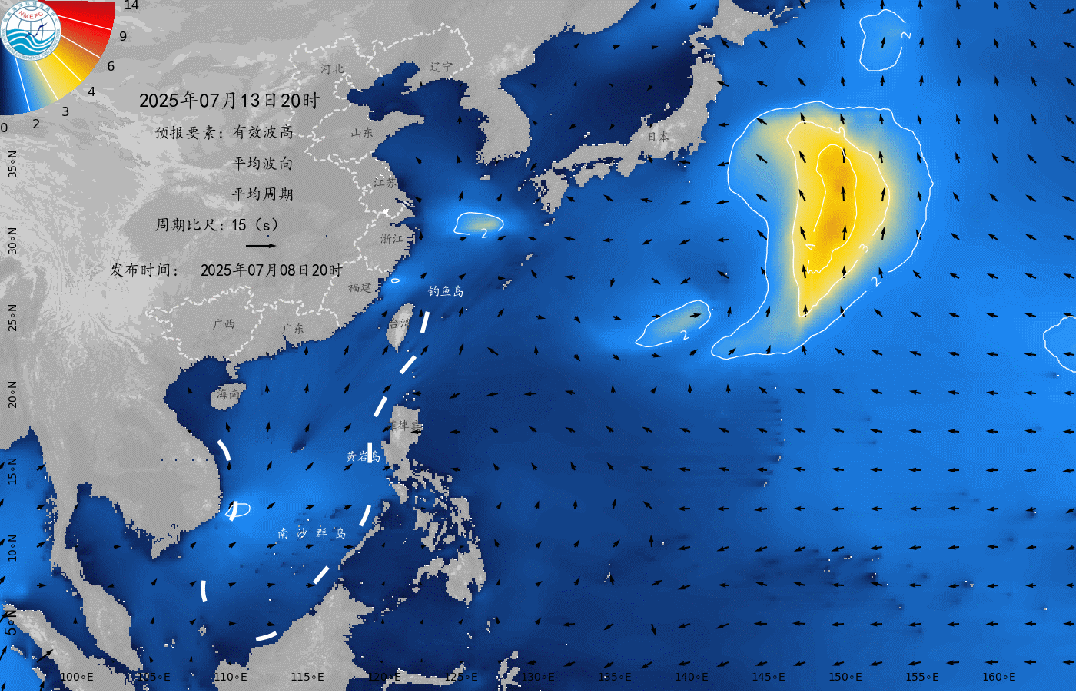 黄海南部、东海、钓鱼岛附近海域有1.5到2.3米的中浪区;