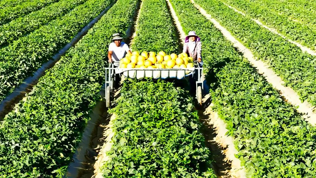 民勤蜜瓜的核心产区位于泉山、收成、西渠等镇。全县16.88万亩蜜瓜田带动“甜蜜经济”,充实消费者“果盘子”,鼓起农民“钱袋子”。(兰州日报社全媒体记者 雒焕素)