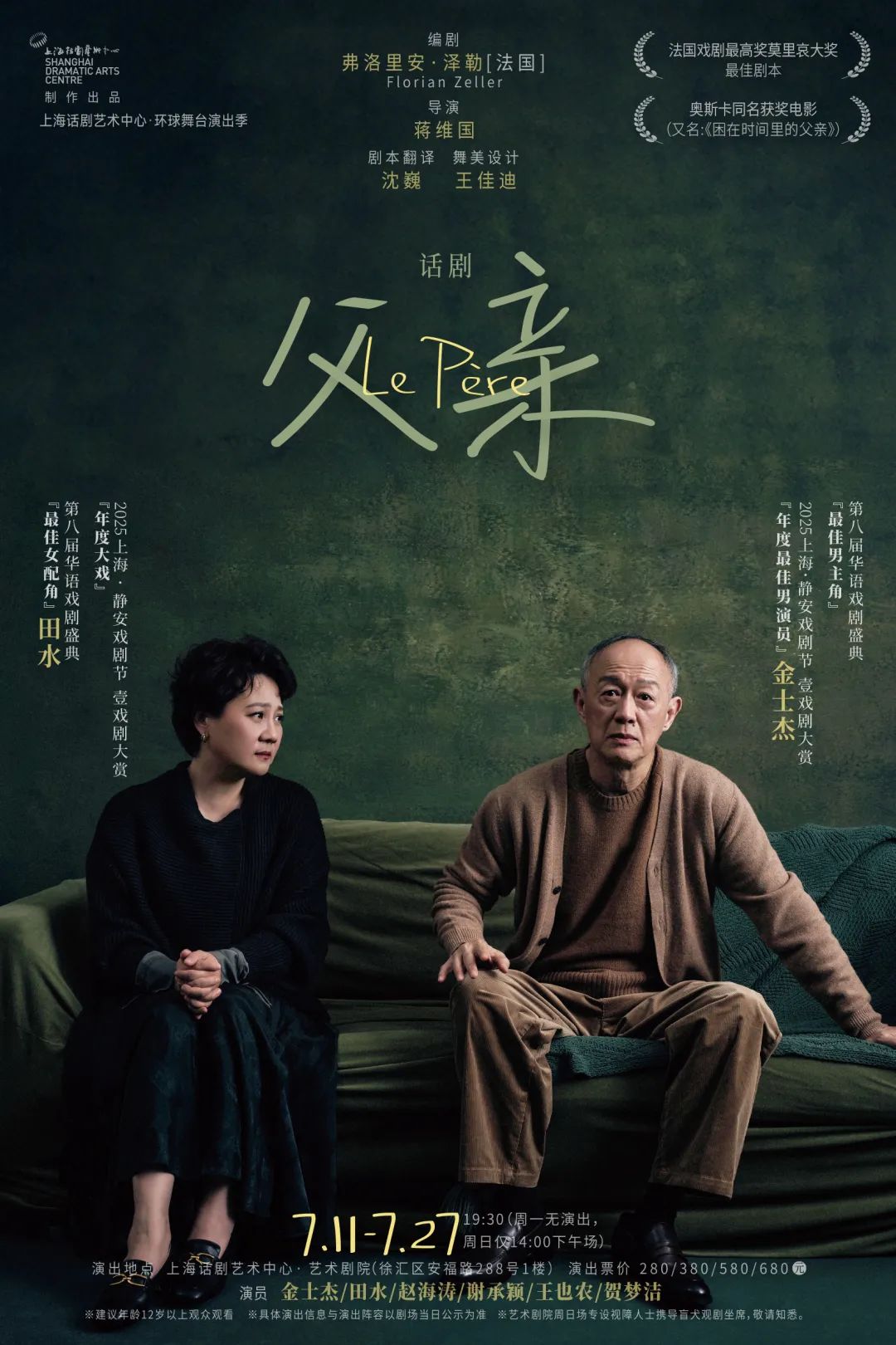由上海话剧艺术中心制作出品的话剧《父亲》,由法国剧作家弗洛里安·泽勒Florian Zeller编剧,导演蒋维国执导,本轮由上海话剧艺术中心导演徐紫东复排,著名表演艺术家金士杰,上海话剧艺术中心演员田水、赵海涛、谢承颖、王也农、贺梦洁共同出演,将于2025年7月11日-27日在上海话剧艺术中心·艺术剧院持续演出。