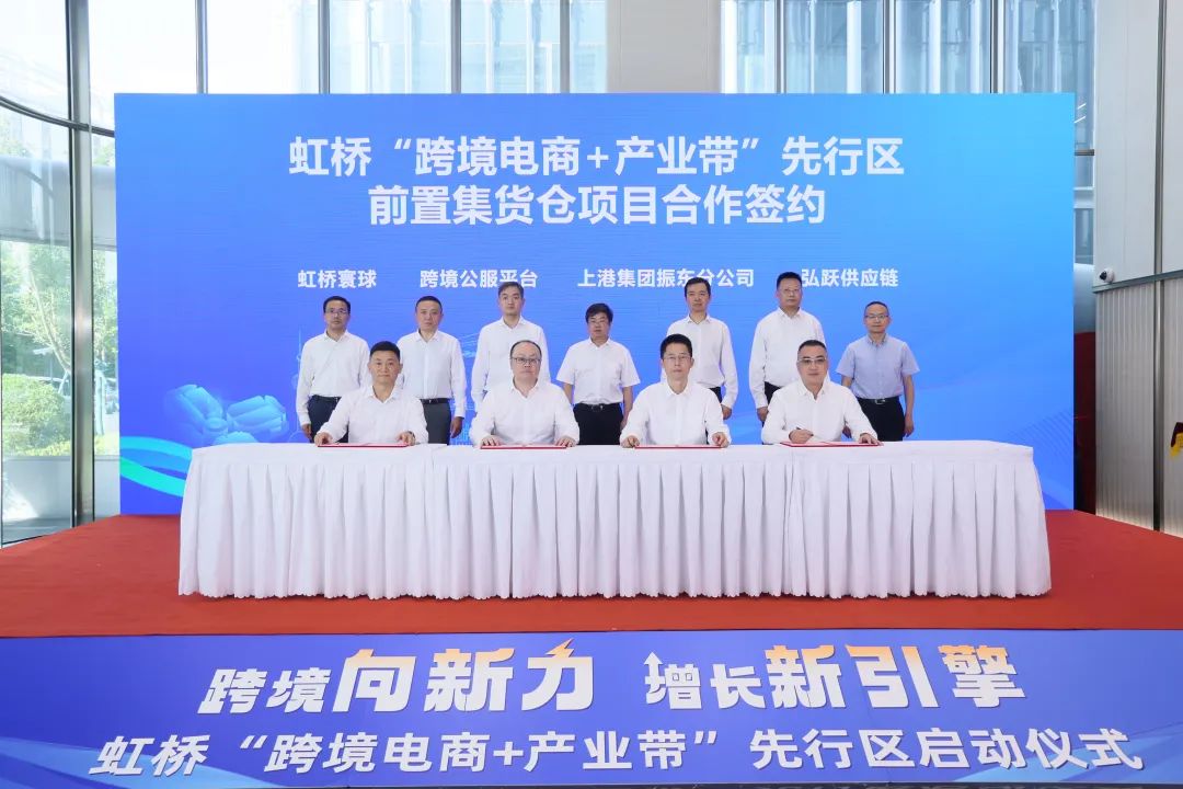 活动现场,青浦区白鹤镇与上海跨境公服签署虹桥“跨境电商+产业带”先行区运营合作备忘录;上海跨境公服、上港集团振东分公司、虹桥寰球跨境电子商务、弘跃供应链开展虹桥“跨境电商+产业带”先行区前置集货仓项目合作签约;弘跃供应链、妃鱼数字、肯超企业管理、紫桐树科技、新蛋商贸等重点项目落地。其中,虹桥“跨境电商+产业带”先行区前置集货仓通过物流企业、港口和政府三方合作联动,依托与港口货站、海关对接可溯源信息化系统,降低入港查验率,提高企业通关便利化,构建高规格长三角物流集货中心。