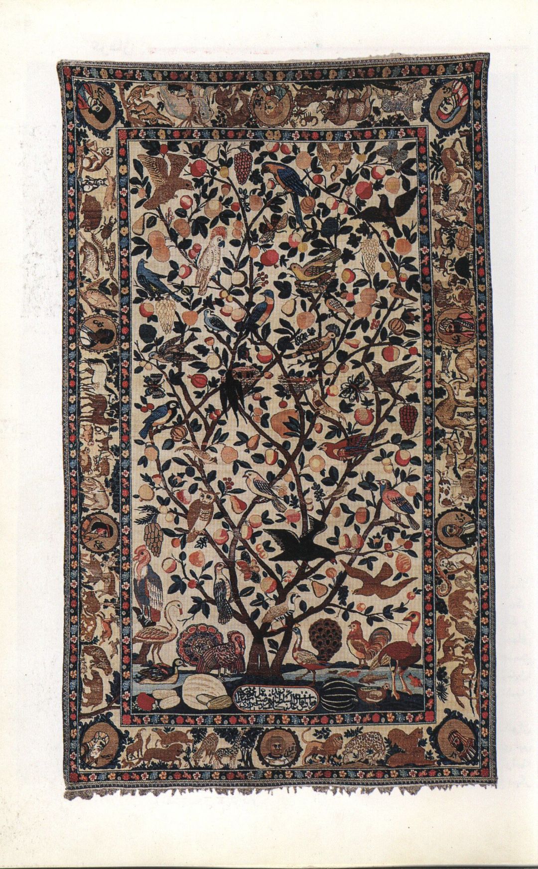 伊朗地毯自古在国际上享有盛誉,展览中就有六幅非常精美的伊朗地毯。其中一件20世纪早期的“克尔曼产羊毛地毯”上绘制了一幅生机盎然的自然画卷。“我们可以看到地毯的主体图案是以三根富有生命力的主枝向上延伸出的‘生命树’,侧枝上缀满了石榴、葡萄等果实,还有鹦鹉、孔雀、火烈鸟等珍禽。”管琳介绍,地毯的主边则由丰富多样的生物以及十枚人物圆形纹章环绕。纹章上分别刻画有身着罗马、印度、中国、阿拉伯、澳大利亚等地传统服饰的人物形象。
