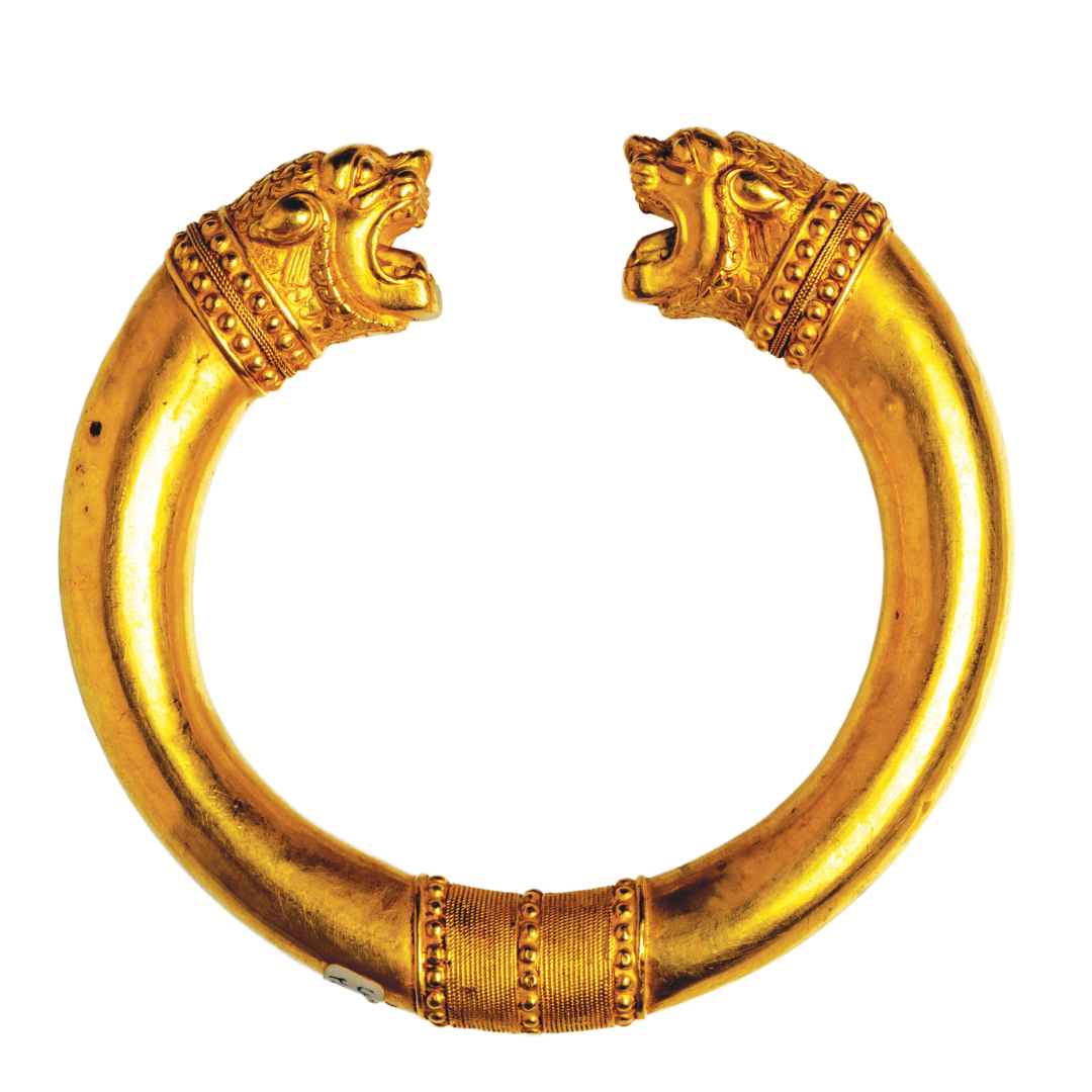 踏入展厅,独立展柜中陈列的黄金狮首授权环成了瞩目的焦点。“在古代伊朗文化中,环形因形似太阳而被赋予了存在、起源、创造与永恒等多重含义。环形物品,如手环、臂环、指环等,曾被广泛地制造和使用。”管琳介绍,这件授权环就是阿契美尼德王朝时期的文物,主要用于统治阶层中上级对下级的权力授予仪式,象征着双方对忠诚誓言的相互承诺。仪式中,统治阶级的中上级与下级共同握住这个授权环,代表了权力的授予。