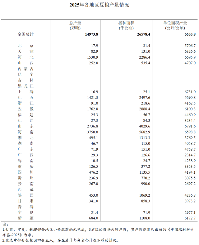 公告显示,全国夏粮总产量2994.8亿斤,较2024年减少3.1亿斤,下降0.1%;夏粮播种面积39867.6万亩,减少52.0万亩,下降0.1%;单位面积产量375.6公斤/亩,增加0.1公斤/亩。
