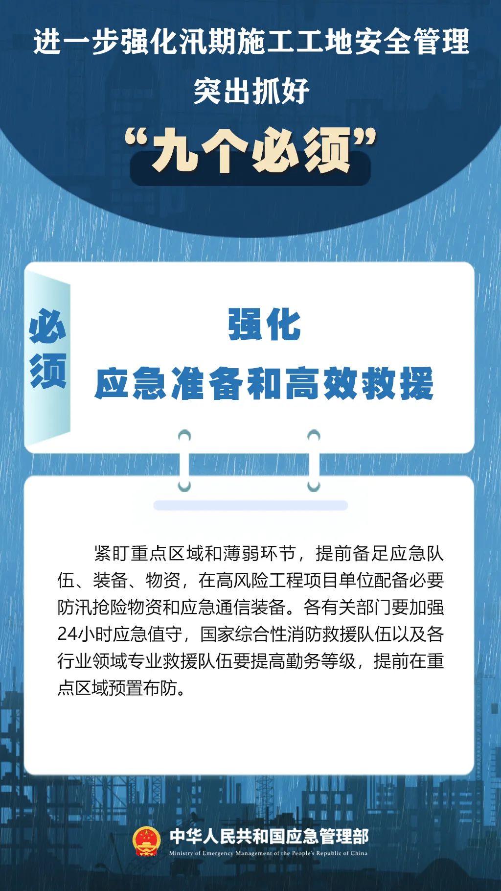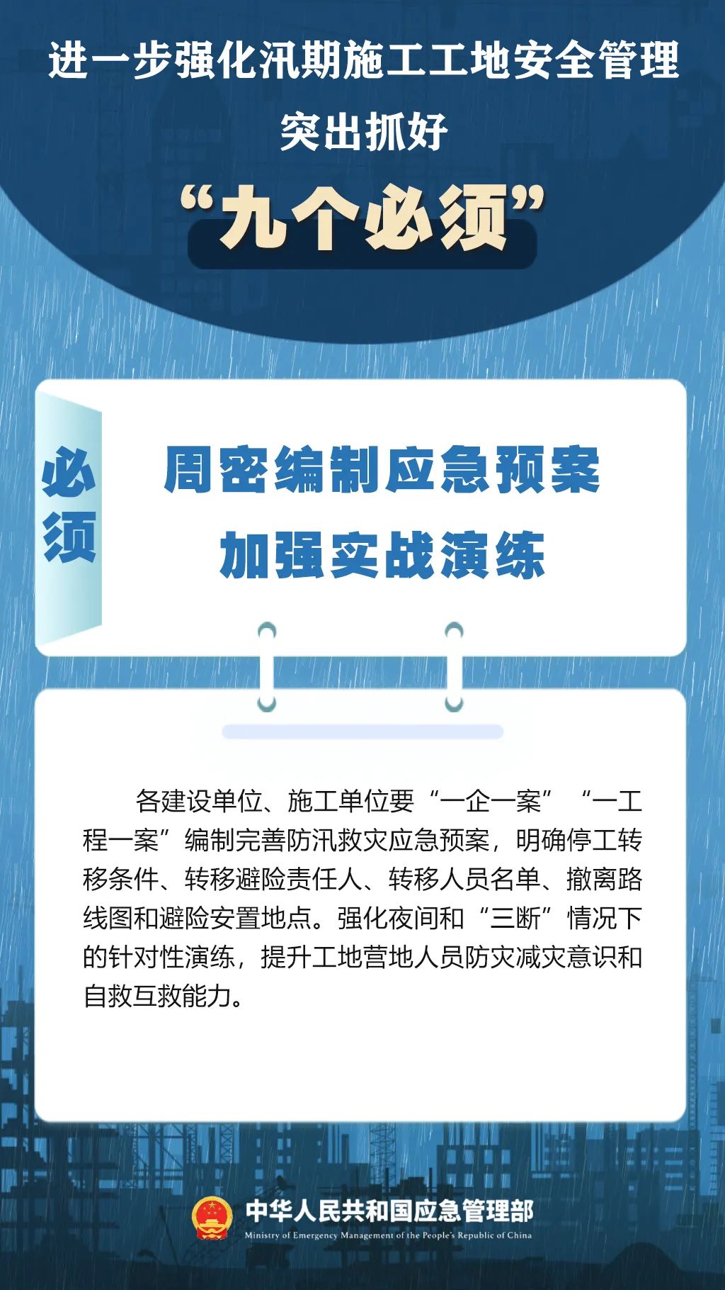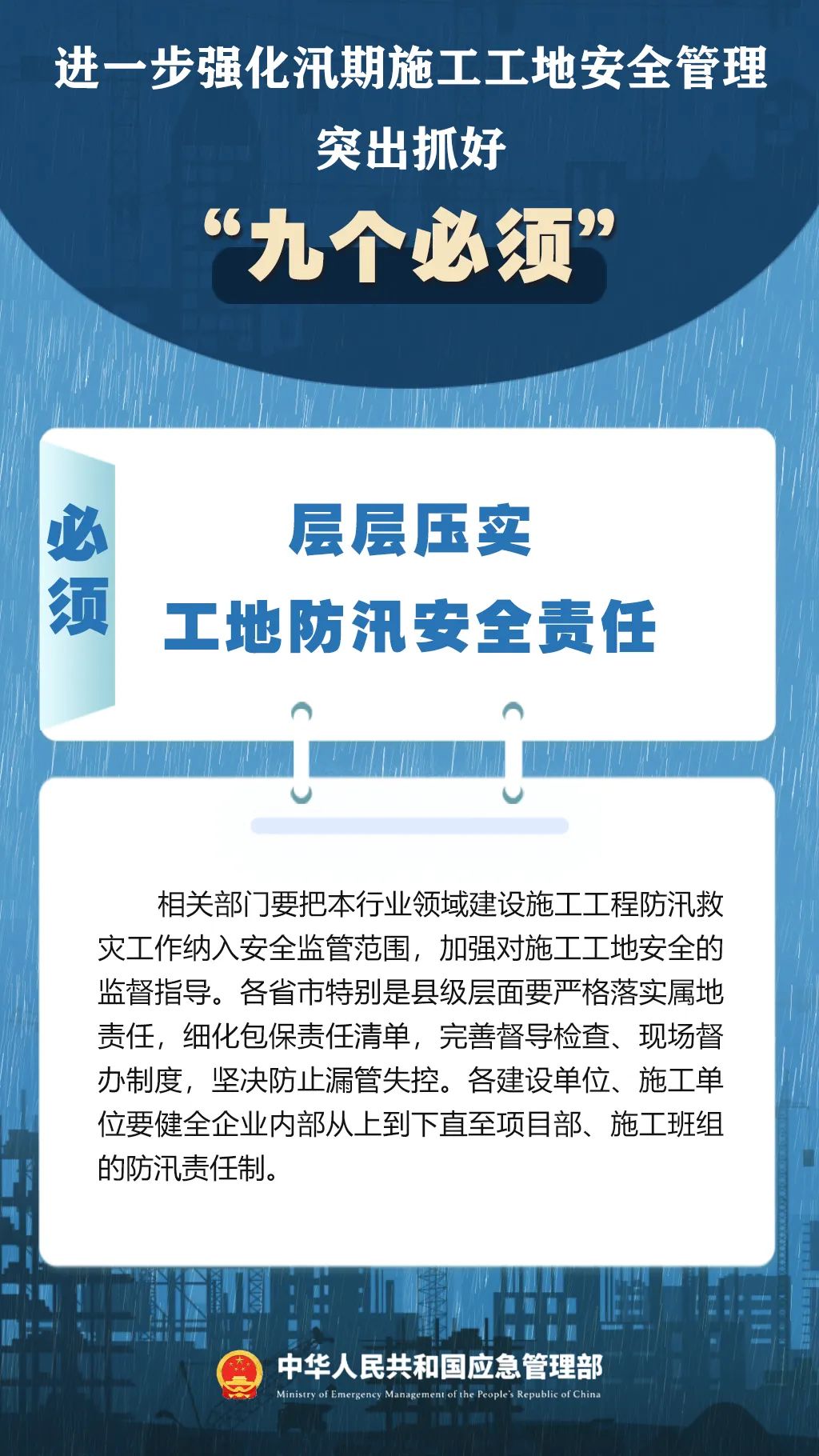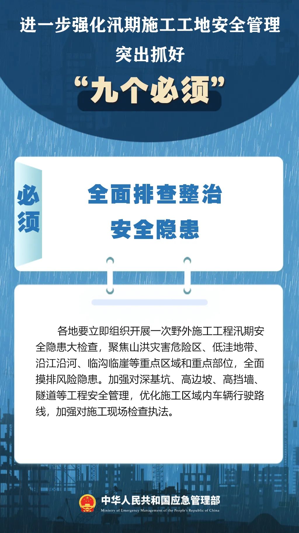 7月9日,国家防灾减灾救灾委员会办公室印发紧急通知,进一步强化汛期施工工地安全管理,要突出抓好“九个必须”↓↓↓