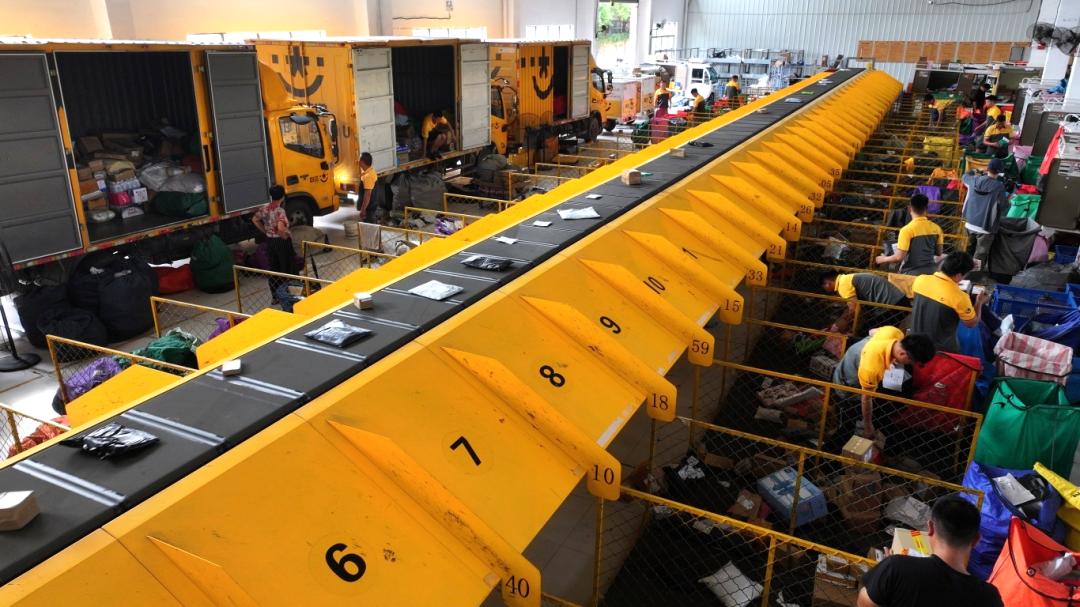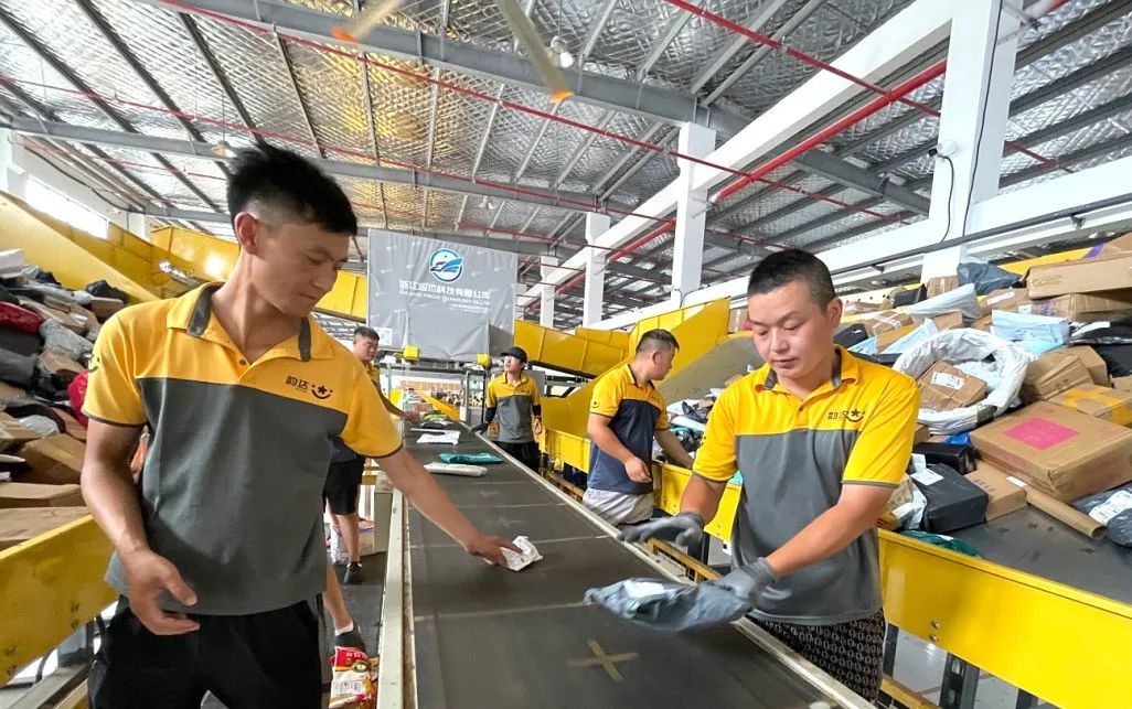 在县韵达快递分拣处理中心,自动化传送带上的包裹如流水般涌动,快递员们有的正忙着把一件件刚运来的快递包裹放到传输带上,有的正将属于自己配送区域的快递包裹进行分拣、扫描、装车,每个步骤都有条不紊,迅速快捷。