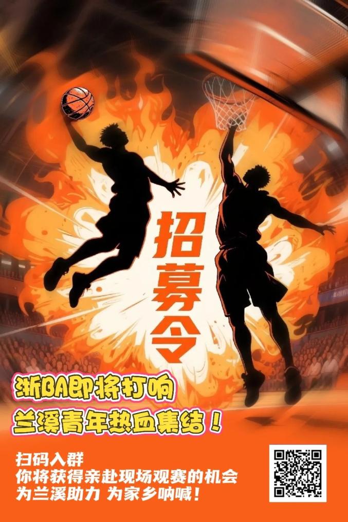 此刻,我们需要每一位充满激情、热爱篮球的兰溪青年!用你们最响亮的呐喊、最炽热的能量,在现场筑起最震撼的声浪,为兰溪助力,为家乡呐喊!