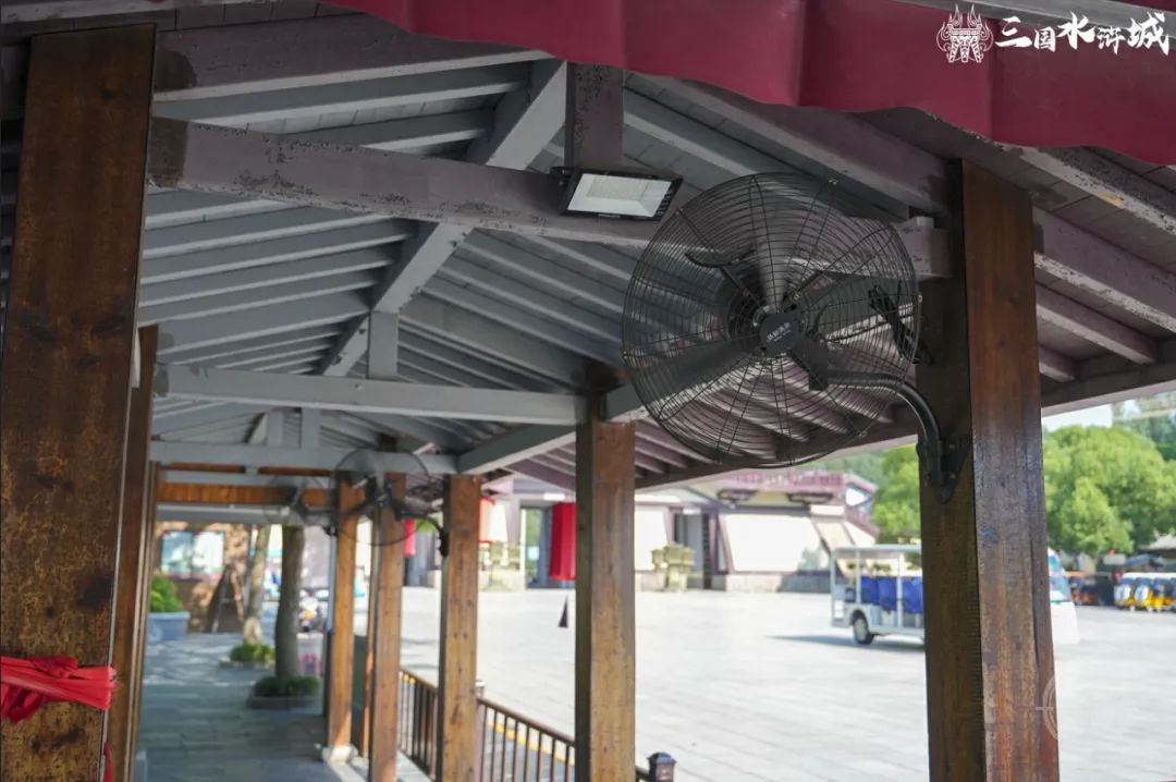 鼋头渚的游船等候区、灵山的十方林、三国水浒城配备了喷雾降温装置,在三国水浒城的游客等候区装上了遮阳棚,灵山景区闸口处的智能新风系统、三国水浒城游览区域的大功率风扇,为游客送去阵阵清凉。