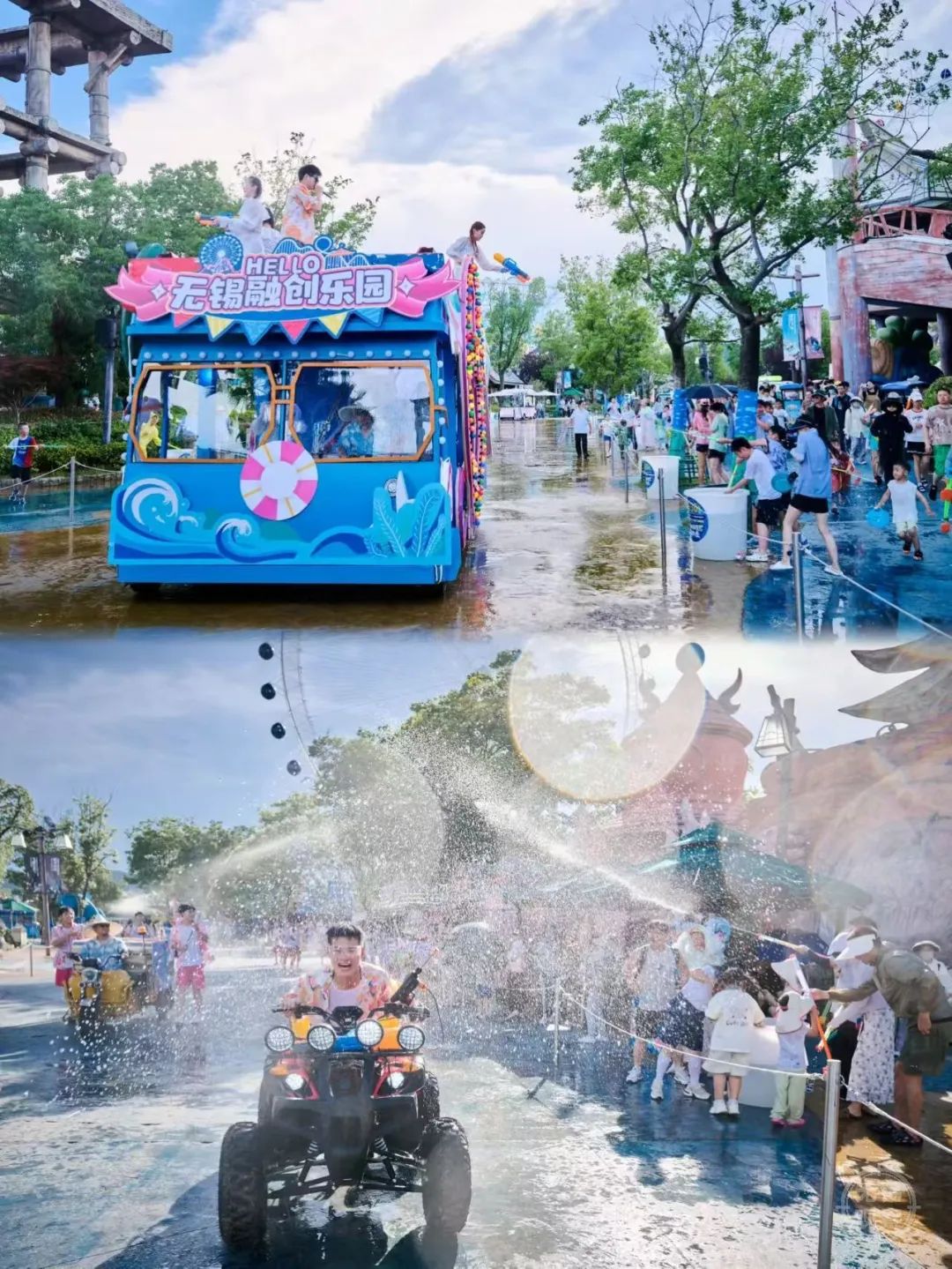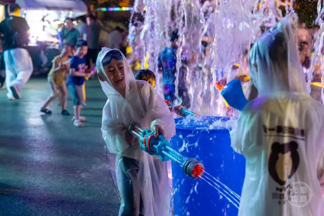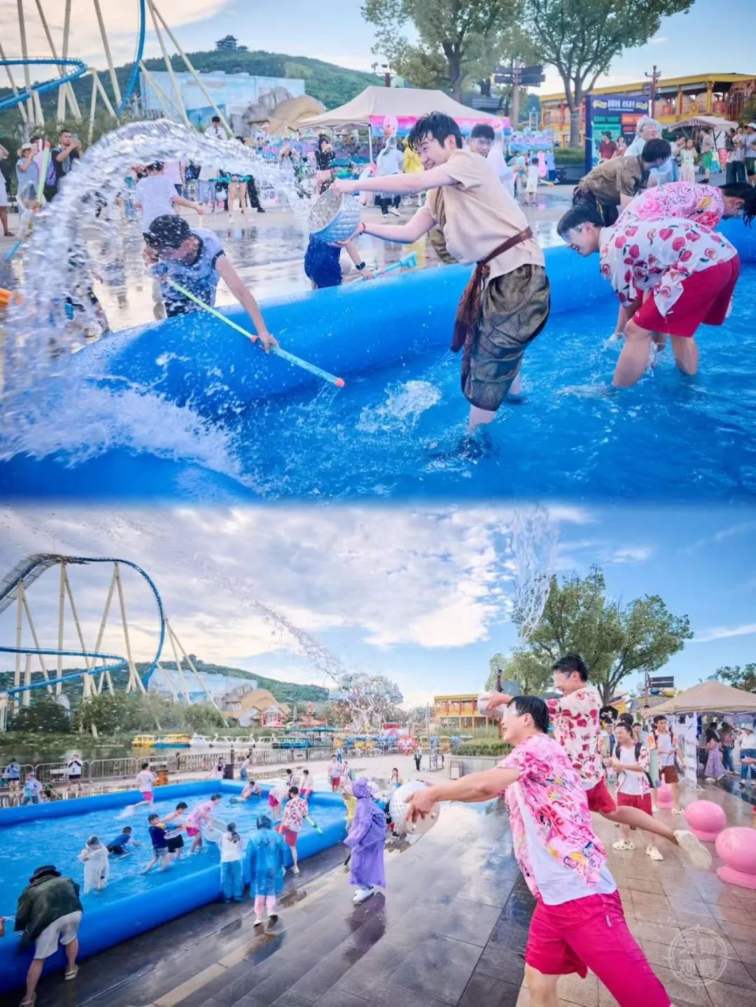 融创文旅城推出“重装水战大巡游”,NPC们扛着水枪与游客展开无差别水战,更有“水浪电音泼水狂欢”将中心湖广场变身露天蹦迪场,配合动感电音和喷泉DJ台带来沉浸式玩水体验。