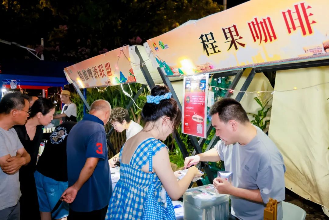 夜市区域同样热闹,烧烤、冰激凌、咖啡、水果以及非遗文创等近20个摊位火热来袭,每个摊位前都是熙熙攘攘的市民。刚落户徐行的咖啡烘焙工厂程果咖啡此次带来新品咖啡豆,受到不少市民的青睐。“原来我们徐行也有自己的咖啡了,以后一定会多多关注。”市民黄慧说。