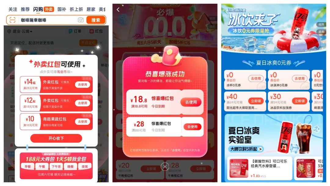 AI蓝媒汇注意到,淘宝闪购今日打出“超级星期六”的口号,释放188元大券包,宣称“1天5顿我全包”。不少用户都基本上拿到了多张“满18.8减18.8”、“满28.8减18.8”的大额券。