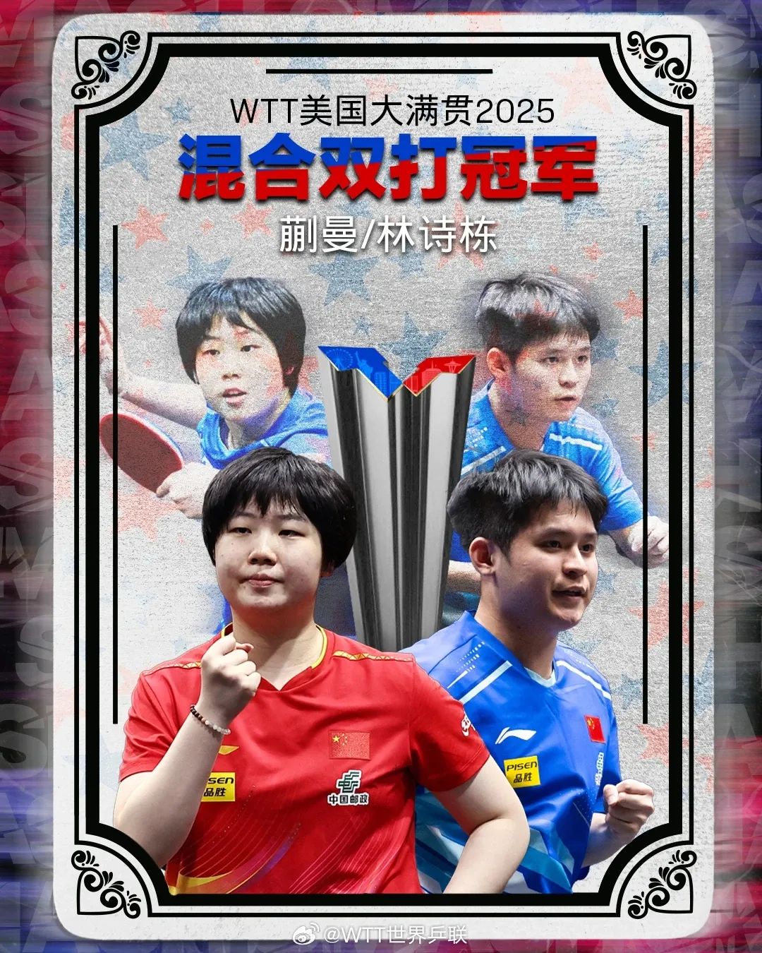 ◆ 在11日进行的世界乒乓球职业大联盟(WTT)美国大满贯赛比赛中,国乒组合林诗栋/蒯曼获得混双冠军;孙颖莎/王曼昱和王艺迪/蒯曼会师女双决赛,提前包揽冠亚军。
