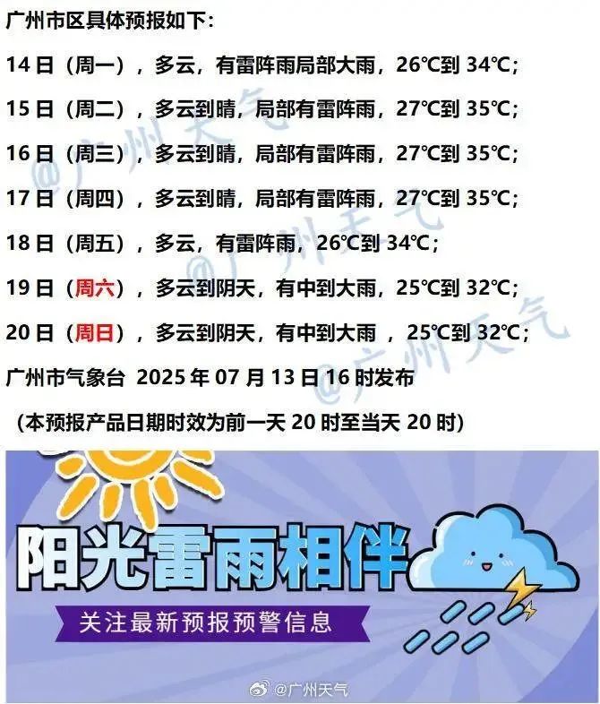 14日,粤北和肇庆市县多云到阴天,有中(雷)雨,局部暴雨或大暴雨,其余市县多云,有分散(雷)阵雨局部暴雨。最高气温:粤北偏北市县和南部沿海市县29℃~32℃,其余市县33℃~36℃。