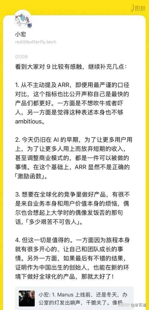 Manus创始人肖宏在社交平台上曾表示,“为了让更多人用上而放弃短期的收入,甚至调整商业模式的,都是一件可以被做的事情。在这个基础上,ARR显然不是正确的「激励函数」。”