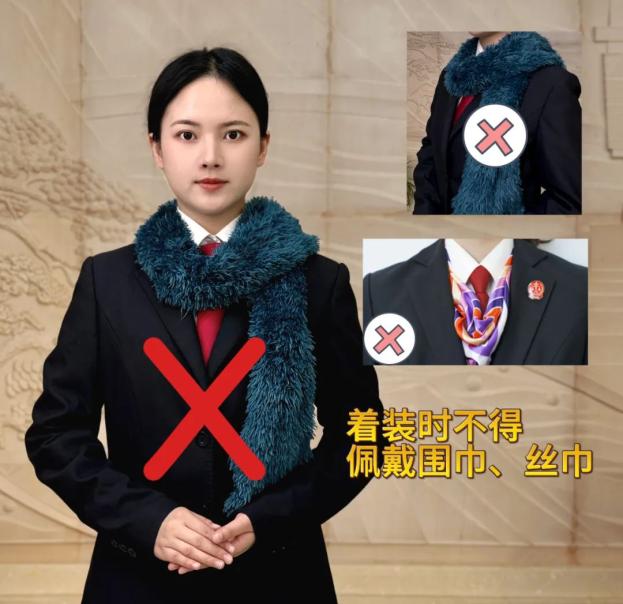 (四)除工作需要或患有眼疾外,着审判制服时,不得戴有色眼镜,不戴美瞳。(五)着审判制服时,应按季节款式规范穿搭,不得夏季、春秋季、冬季制服混穿,更不得与便服混穿(见图)。