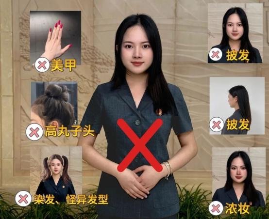 (二)着审判制服时,不得系扎围巾,不得染彩发,不得留怪异发型。男性人员不得留长发(发长侧面不过上耳沿,后面不过衣领)、蓍胡须、不得剃光头(患脱发性疾病除外);女性人员留长发者不得披散发,不得染指甲、化浓妆,不得佩戴耳环、项链等首饰(见图)。