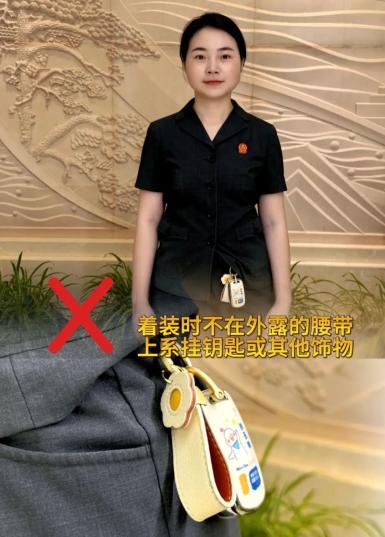 (三)着审判制服时,不得在外露的腰带上系挂钥匙或者其他饰物(见图)。