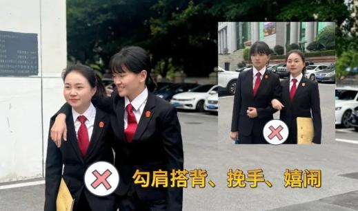 (七)着审判制服时,不出现与他人勾肩搭背、挽手、嬉闹等不雅行为(见图)。