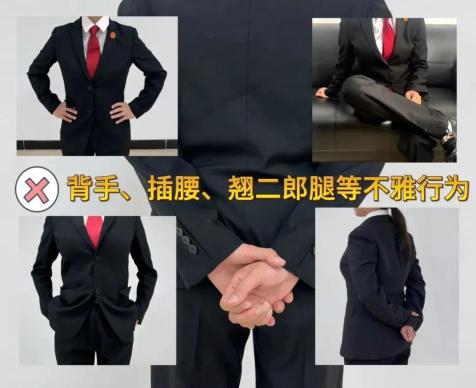 (十)着审判制服时,不背手、不插腰、不翘二郎腿等不优雅行为(见图)。