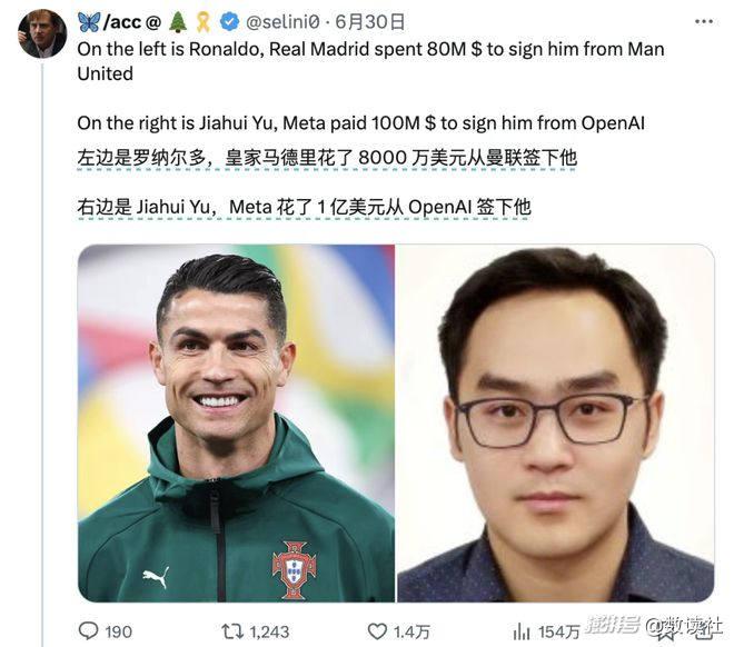 1亿美元薪酬事件传出后,有人甚至将余家辉与足球明星C罗做了对比,用以凸显薪酬的疯狂程度。当然,随后Meta进行解释称,这一数字并非直接给到个人的年薪,而是包括各种福利和奖励在内的总包方案,变相承认了天价年薪的真实性。