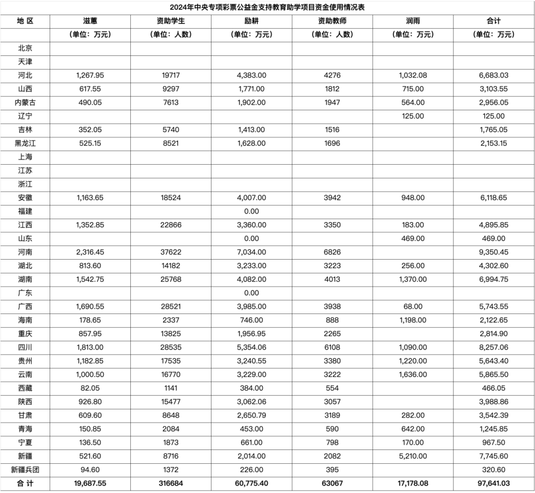 近日,中国教育发展基金会发布了《2024年中央专项彩票公益金教育助学项目公告》(以下简称《公告》)。《公告》显示,2024年,财政部下达中央专项彩票公益金教育助学项目100000万元,其中,滋蕙计划20000万元,励耕计划62500万元,润雨计划17500万元,实际支出97641.03万元,结转2358.97万元,结转结余资金按国家有关结转和结余资金规定进行管理。